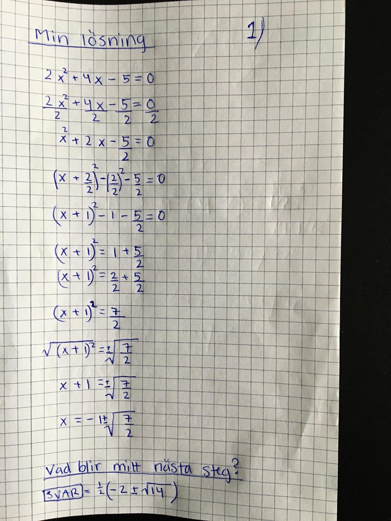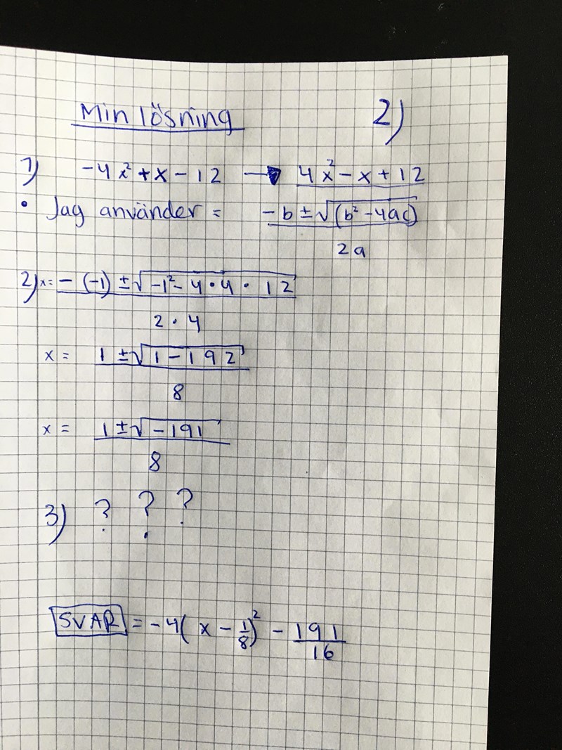 1) Jag försöker lösa den kvadratiska ekvationen.