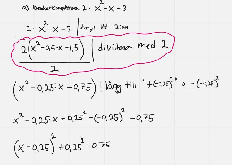 Så en start är att du korrekt bryter ut tvåan: 2x^2-x-3=2(x^2-0.5x-1.5)