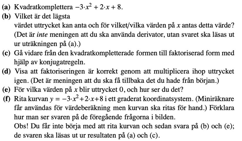 Om vi kallar uttrycket för f(x), dvs f(x) = -3x2+2x+8, så vill de att du ska ange det lägsta värdet som f(x) kan anta.