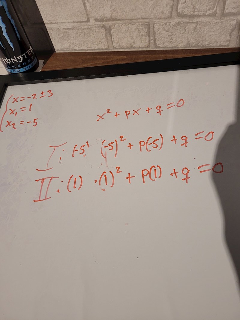 jaricyber skrev:Här kommer en enklare lösning. Detta är ju en ekvation med två lösningar. Om vi sätter in dessa i ekvationen så får vi ett ekvationssystem som ger värden på p och q. Lösningarna är - 5 och 1. Detta ger: