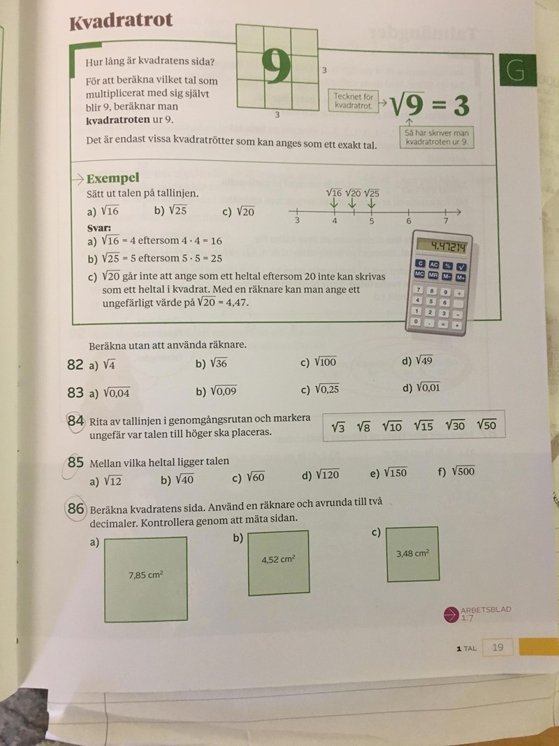 hej behöver hjälp med 84 tack förstår inte vad dom menar min lärare sa att jag skulle göra typ roten ur 3 med miniräknare och sen sätta ut det men va?
