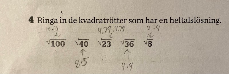 Det här kanske är en lite enkel fråga haha, men jag förstår inte vad de vill att jag ska ringa in? Vad innebär ”de som har en heltalslösning”? Heltal är väl tal som inte är decimaltal? Jag förstår ju lite här. Roten ur 10 är ju 100. Men jag förstår inte vad jag ska ringa in.