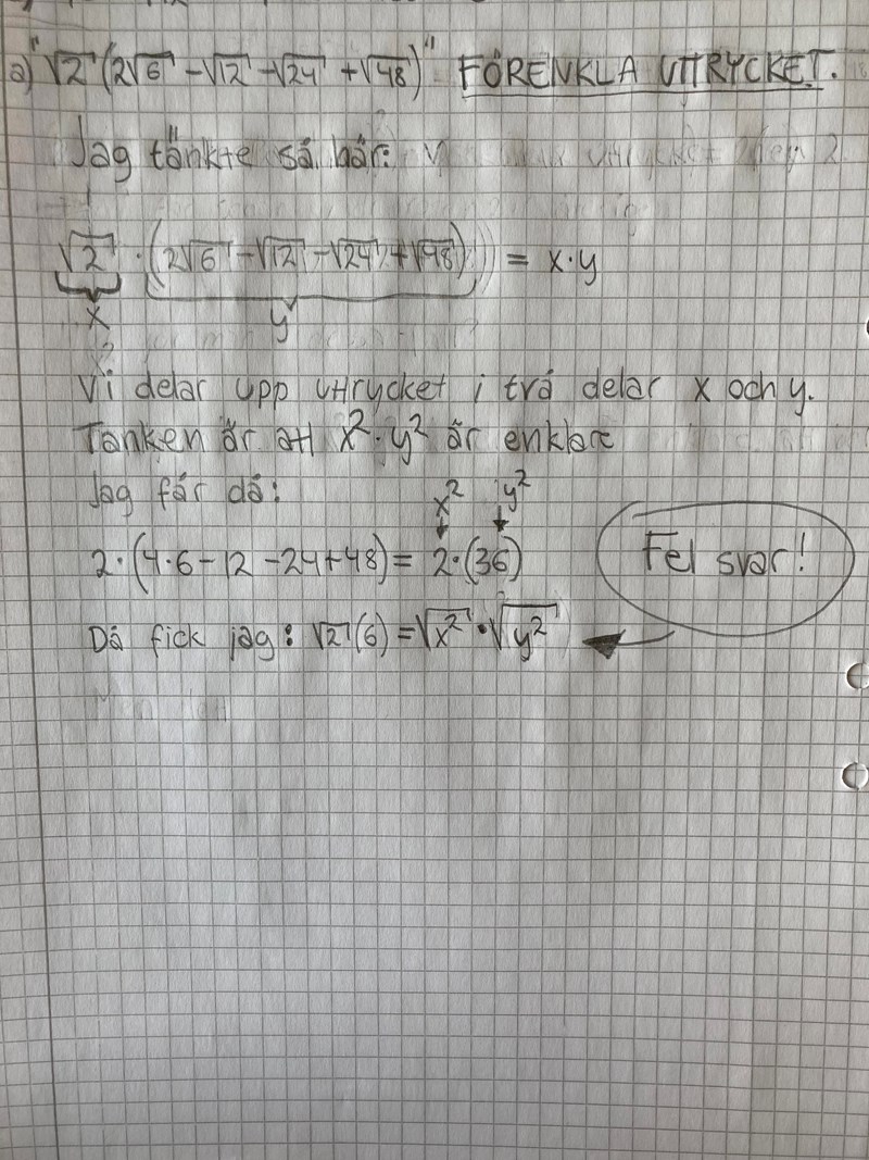 Det blir fel när du beräknar , du kan inte ta varje term och kvadrera separat. Kom ihåg att är samma som , dvs: