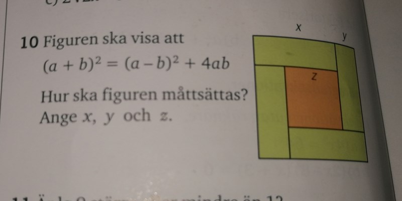 Det är det ena sättet - bra! Det andra sättet består av en orange kvadrat plus 4 gula rektanglar. Kan du uttrycka detta med hjälp av x, y och z? Kan du uttrycka detta med hjälp av x och y?