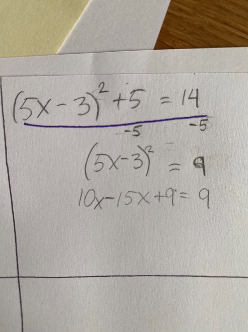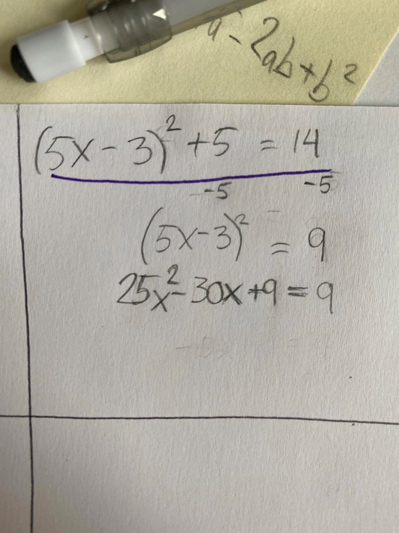 Såg nu att andra termen också är fel, ska inte vara -15x. Använd kvadreringsregeln
