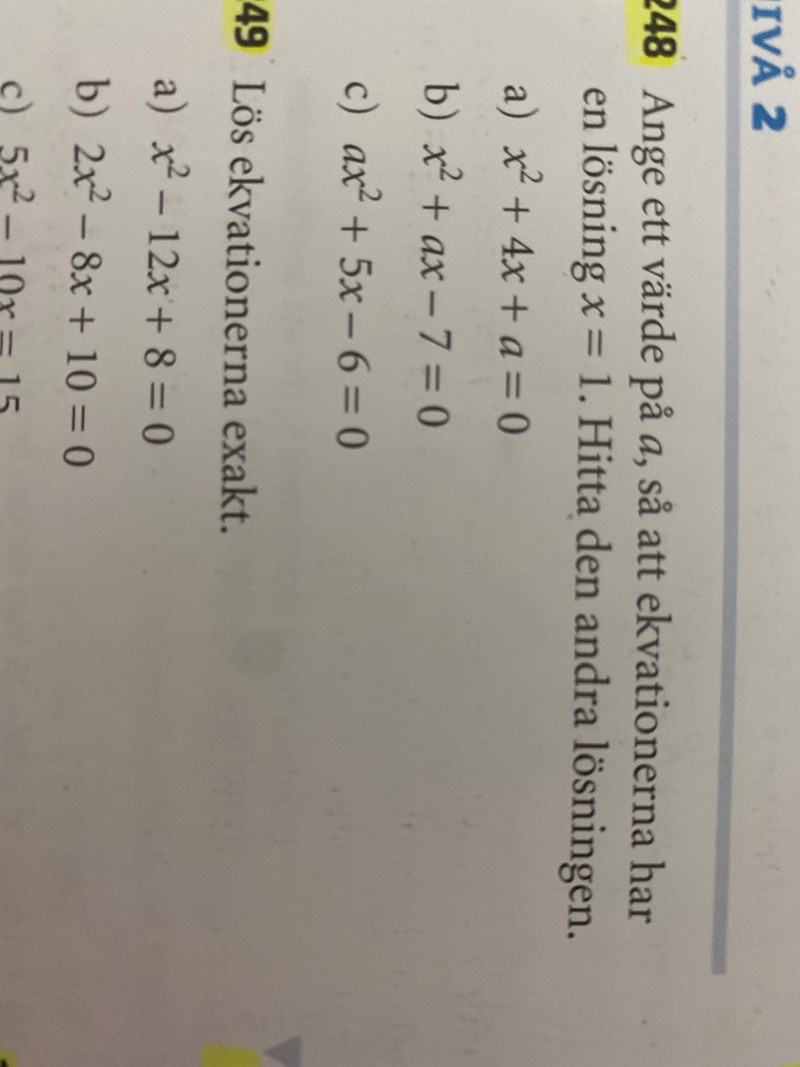 Calle_K skrev:Börja med att bestämma a, sedan sätter du in värdet på a i ursprungsekvationen och löser den som vanligt.
