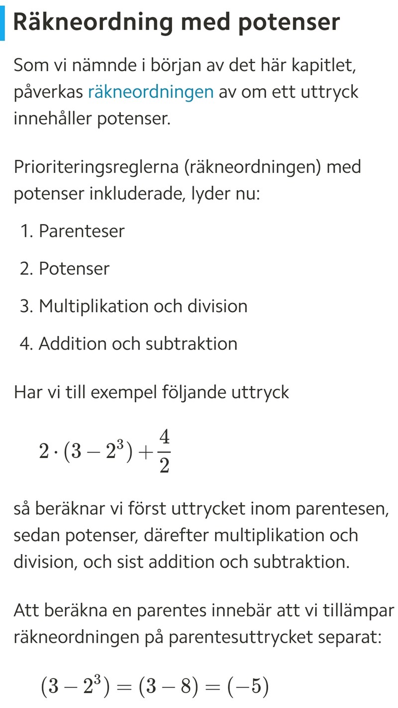 Lina94 skrev :Men vänta nu... så det är alltid bara sist nämnda som upphöjningen sker på? d.v.s så sker ingen upphöjning på a så länge det inte är parentes?