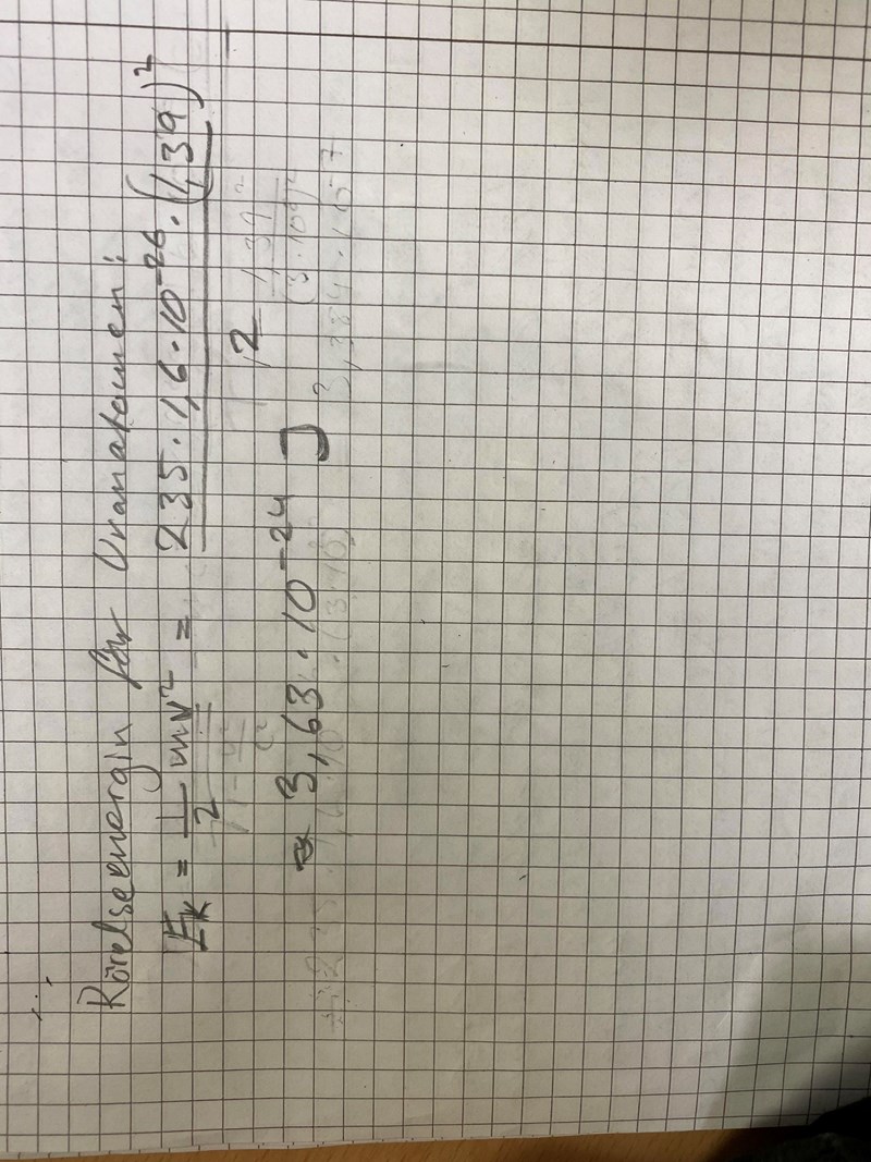 En uranatom har en hastighet 1,39m/s som har rörelseriktningen som vinkelrät mot en detektor platta. 2cm från detektorn skickas en foton ut med energin 7,956x10^-134 J. Fotonen skickas ut vinkelrätt mot rörelseriktningen. Beräkna rörelseenergin hos uranatomen när den kolliderar med detektorn plattan.