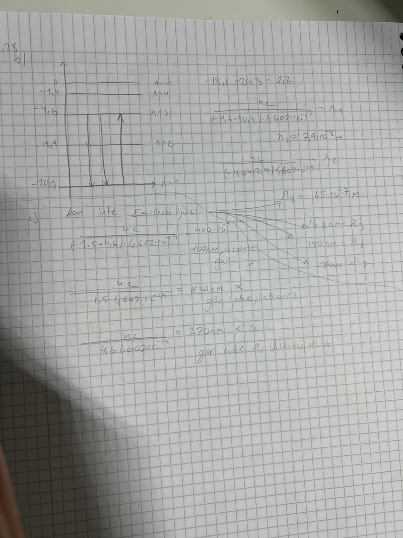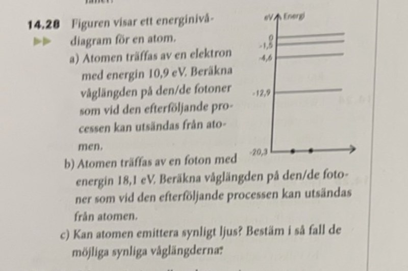 Du ritade en pil uppåt från grundtillståndet till nivån vid -4,6 eV. Men det matchar inte den givna fotonenergin.