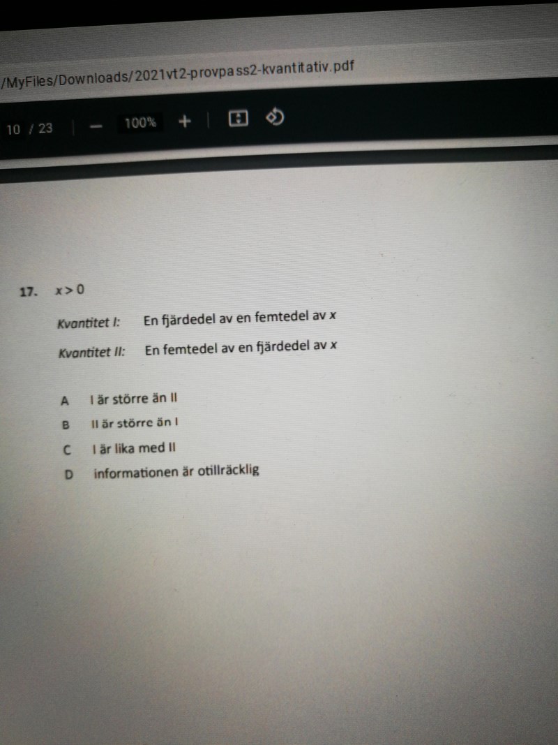 Jag har ej riktigt förstått den där frågan. Jag försökte sätta dem på gemensam bråk och se om det är någon skillnad. Men det känns som att alternativ D är passande..