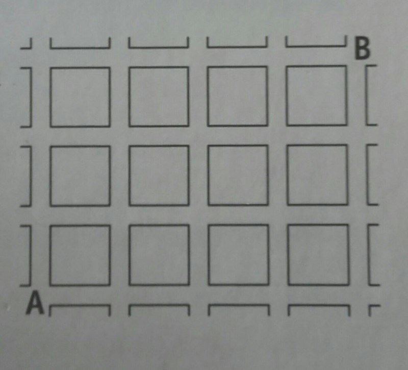 I ett kvarter med parallella gator ska Pontus gå från A till B. På hur många sätt kan han gå kortaste vägen från A till B?