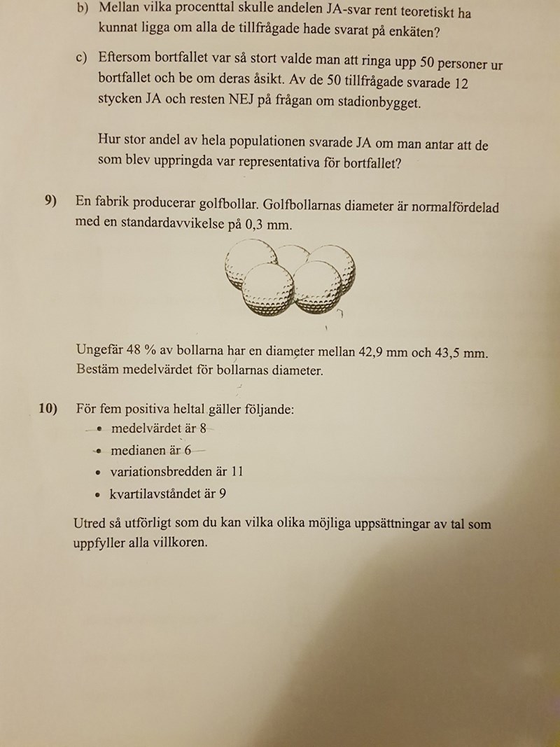 Jag behöver hjälp med uppgift 10. Man vill ha ett kvartilavstånd som är 9. Som jag räknat ut det finns det bara en lösning då 3,4,6,13,14. I facit står det 3,5,6,12,12 eller 2,6,6,13,13 eller 4,4,6,11,15 men då är kvartilavståndet 7. Kan det vara så att man råka skriva 9 istället för 7 i kvartilavstånd i frågan eller har jag fel?