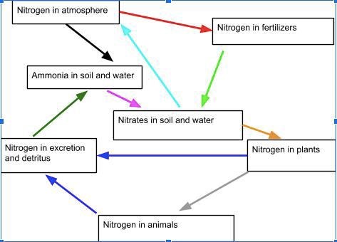 Jag fattar att pilen ska läggas till från "nitrogen in animals" till "nitrogen in plants" och jag förstår att växten måste äta djuret för att få i sig näring då det inte finns tillräckligt men näring i jorden. Men vilken process är det på listan från 1-9?