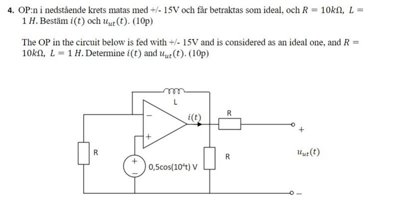 Det är en negative feedback och ideal OP, i1 = U/R = 0,5e^(j10^4t)/10k = 0,5e^j(10^4)t.