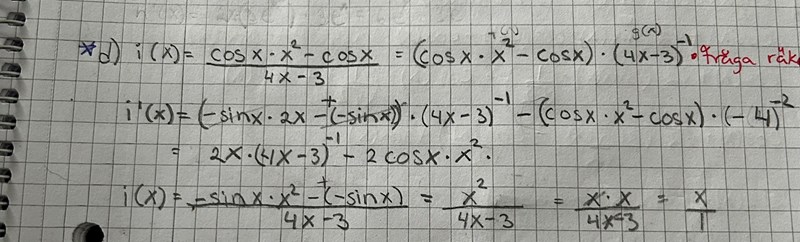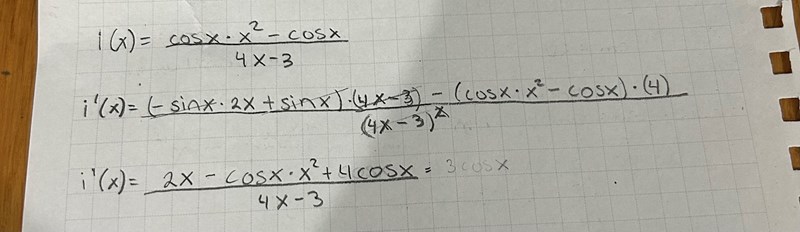 Tänk oxå på att det blir produktregeln när du deriverar cos(x)*x2.