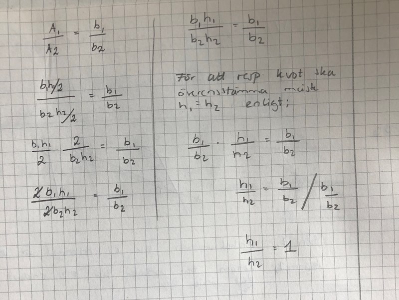 jag har försökt lösa denna upg "Visa att om kvoten mellan areorna i två trianglar är lika med kvoten mellan dess baser, så har trianglarna samma höjd".