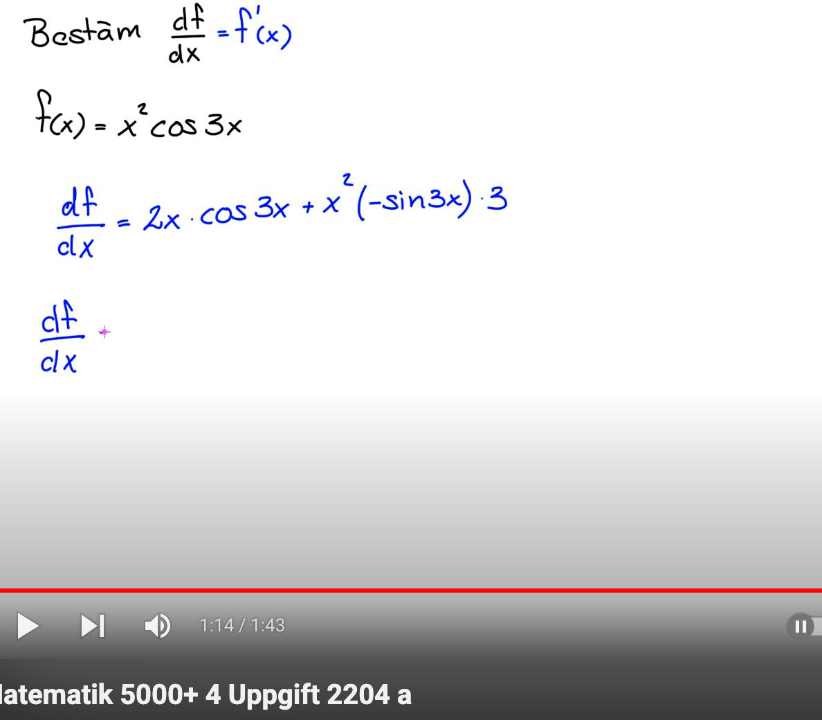 Jag tror jag fattade. Jag börjar med kedjeregeln och får ut derivatan av cos3x till -3sin3x