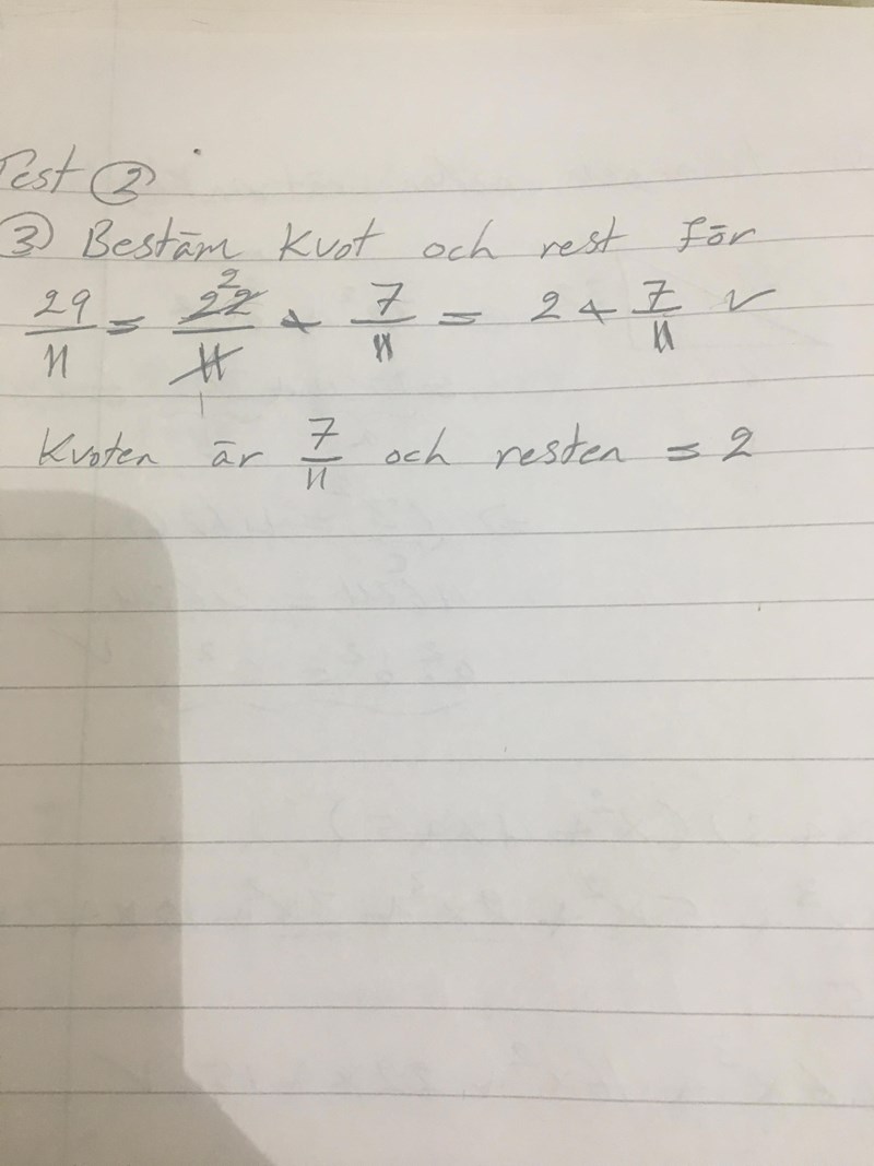 Du har en helt vanlig division. Kvot är svaret på vad det blir. Antingen 2 om man bara vill ha heltal, eller 2+7/11 uträknat om man vill ha decimaler. Vill man bara ha heltal klipper man bort det som blir kvar (7) och kallar det rest. Sen kan du skriva svaret som jag gjorde här ovanför för att se att det stämmer. 11*2=22, och plus 7 blir det 29.