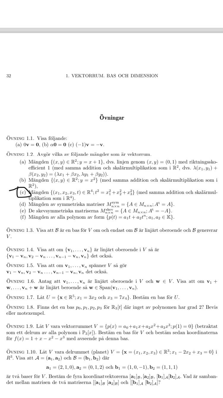 Förstår inte varför 1.2 c) inte är ett vektorrum. Har försökt använda mig av vektorrumsaxiomen men förstår inte vilket av de som skulle motsäga att detta är ett vektorrum.