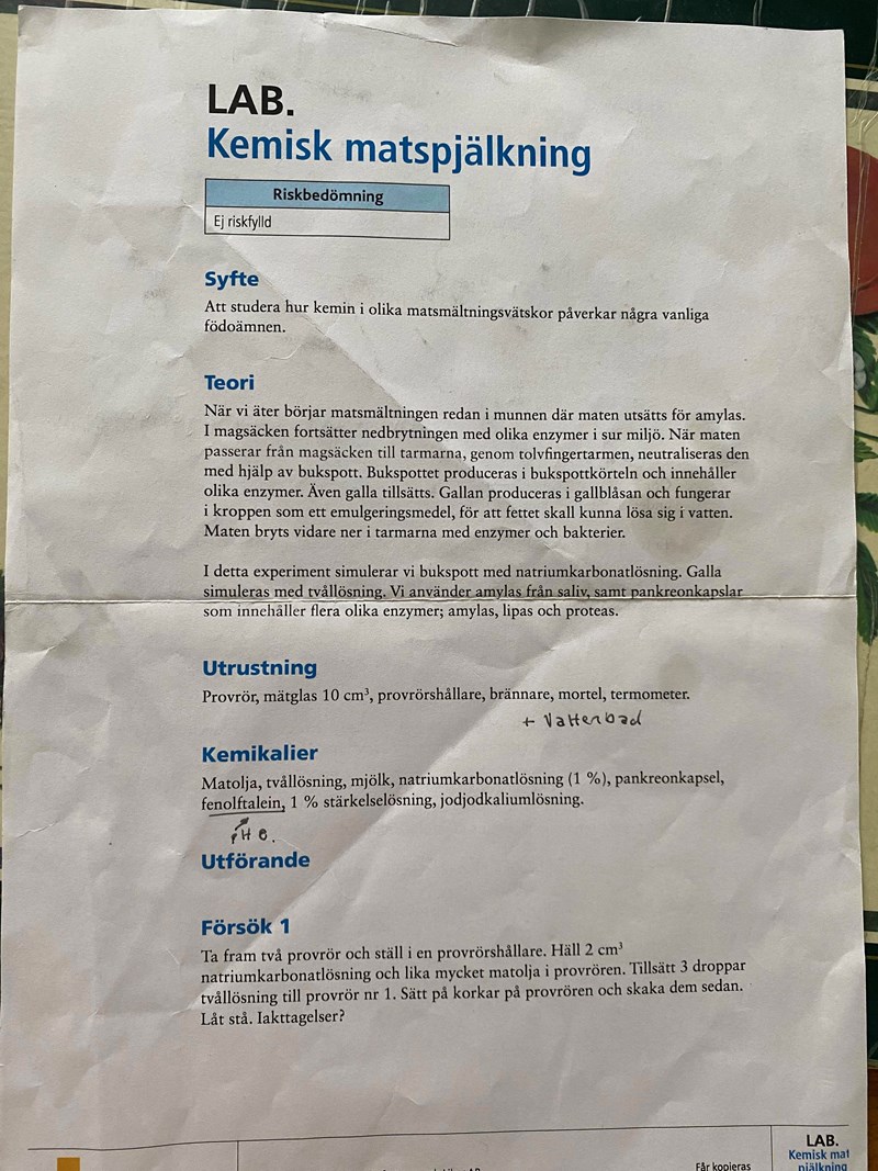 Syftet med laborationen var följande: " Studera hur kemin i olika matspjälkningsvätskor påverkar några vanliga födoämnen"