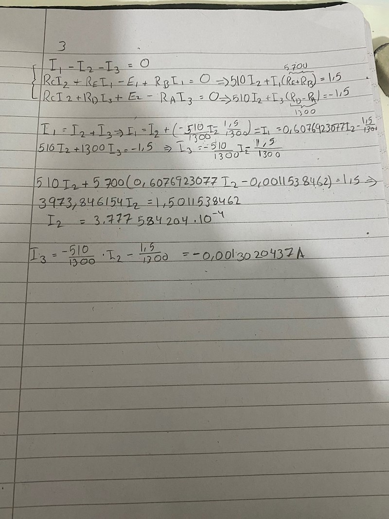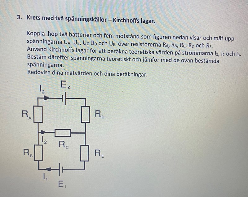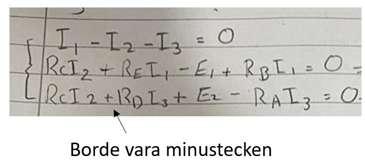 Titta på dina potentialvandringar. I figuren flyter strömmen I1 genom RE, men i dina uträkningar flyter I2 genom RE. I figuren flyter strömmen I3 genom RD, men i dina uträkningar flyter I2 genom RD.