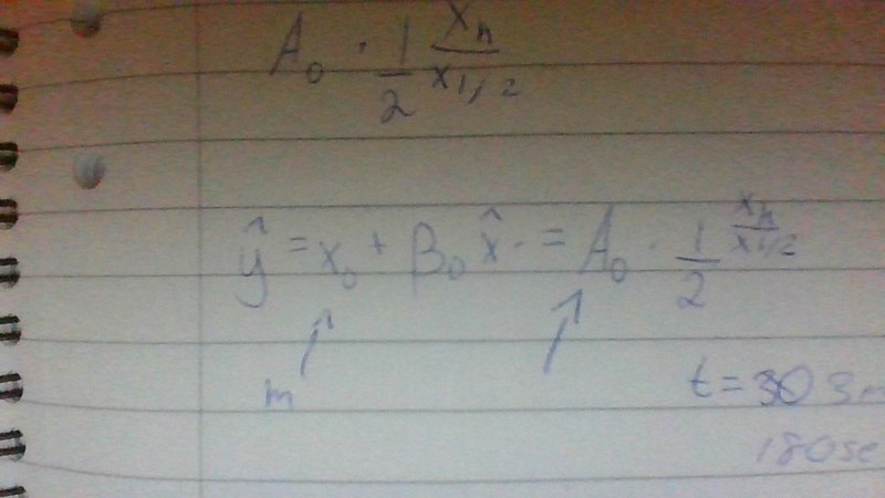 Här kommer labboration beskrivningen: Experiment beskrivelse: För denna laboration ska vi se hur mycket radioaktivitet x antal papper hindrar och sedan beräkna halveringstiden. Detta utförs genom att hålla ett visst antal papper mellan det radioaktiva ämnet och Geigermätare under 30 sekunder. Tillägg 5 st papper efter varje omgång som ska vara 30 sekunder. Gör detta tills man når 30 st papper, logaritmera sedan y värden och sätt in det i statscalculator.com.