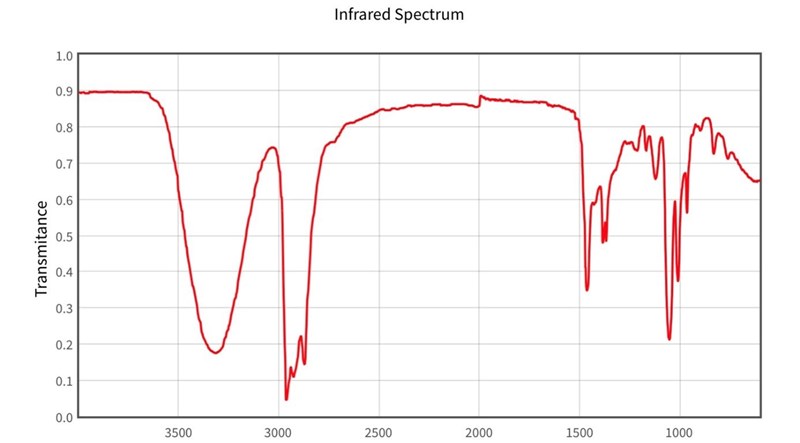 Figur 3: IR-Spektrumet visar de olika funktionella grupperna för molekylen av ämnet 1-Butanol, 3-methyl- (C5H12O). Den visar även bindningarna som finns mellan atomerna samt fingeravtrycksområden.