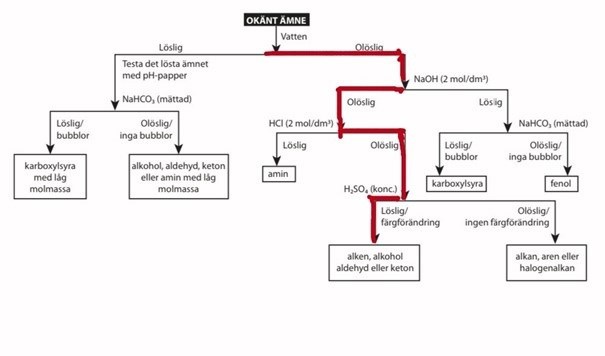 Figur 1: Figuren visar det löslighetsschemat som följdes under laborationen, där det rödmarkerade visar de steg som togs för att komma fram till identifiering av det okända ämnet som laboranterna fick