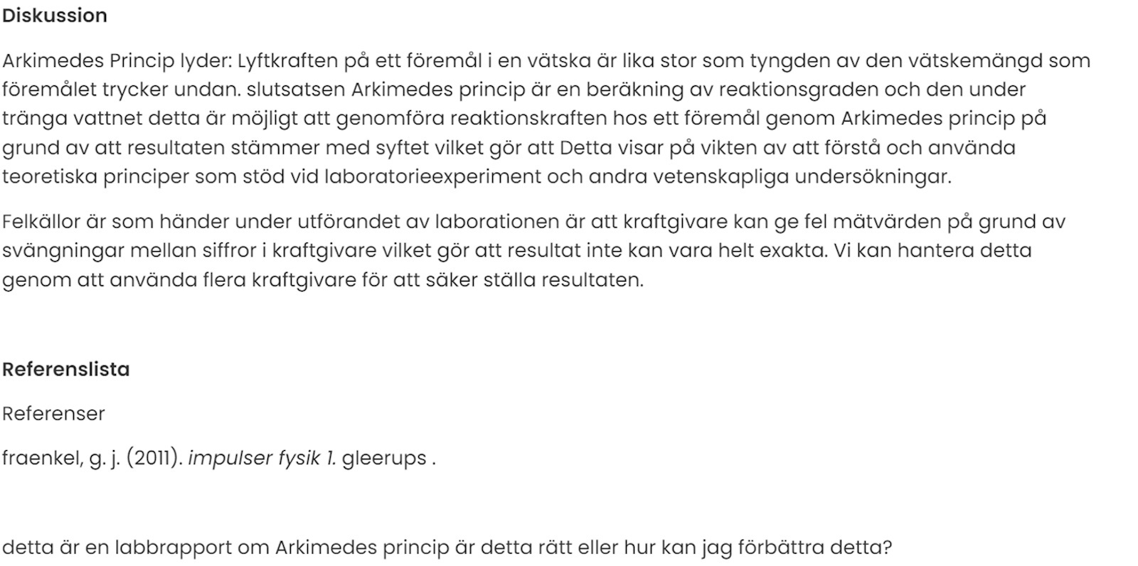 För övrigt finns andra konstiga termer som "labquest", "loggerpro" och "reaktionsgraden". Du har glömt stor bokstav i början av en mening "slutsatsen Arkimedes princip..." med mera.