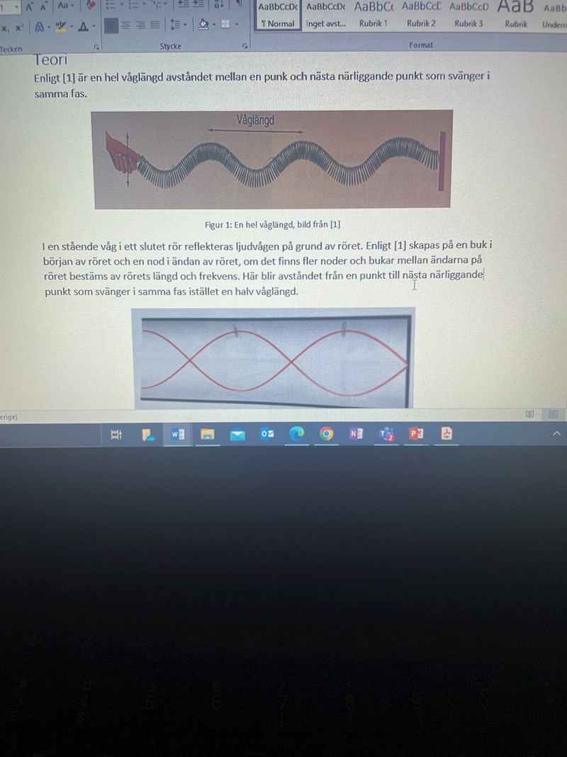 i min labbrapport vill jag förklara hur lång en våglängd är (jag har sagt att det är avståndet mellan en punk och nästa närliggande punkt som svänger i samma fas). Men i ett rör så studsar ju ljudvågen och det blir ”två” vågor. Och i detta experiment behövde man ta reda på våglängden för att räkna ut hastigheten. Och då mätte vi från en buk till nästa närliggande buk. Och detta blir ju då en halv våglängd så vi gångra det med två för att få hela våglängden.