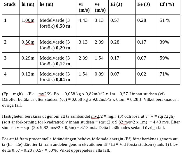 Tack för svar! Det är energiförlusten i procent jag syftar på, men som sagt räknas hastighet och höjdskillnad också ut. Detta mättes nog inte så säkert eftersom det försökte beräknas i farten samtidigt som bollen stutsar. Jag har dock följt instruktionerna och antar att det är något jag får ta upp i diskussionen.
