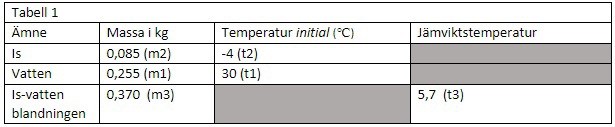 Från början hade du m1 gram vatten (med temperaturen t1)och m2 g is (med temperaturen t2). Efteråt hade du (m1+m2) g vatten med temperaturen t3.