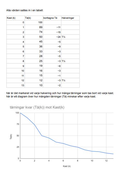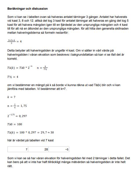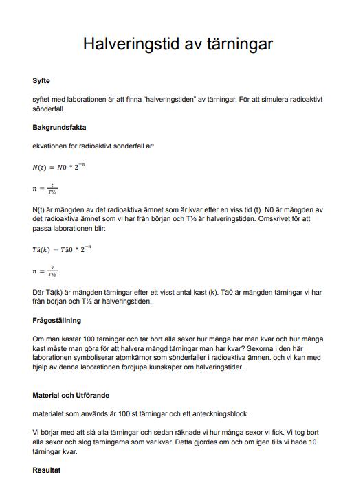 Här är en labb som jag har gjort den är inte helt klar än men jag undrar om jag har gjort något fel med beräkningen av halveringstiden. Som man kan se i diskussionen så har jag kommit fram till att mina beräkningar är fel (eller har en fel marginal) Men jag kan inte komma på varför det har blivit fel, eller hur jag ska förklara felmarginalen.