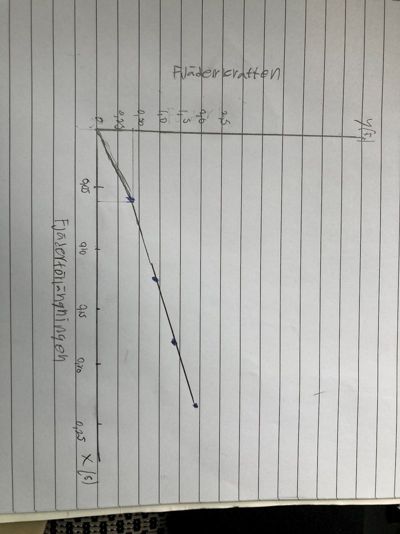 Borde jag kunna använda det den formel som vi använde oss utav innan som visade att fjäderkonstanten plus diagrammet och svara. Fjäderkonstanten är 8,0 N/m