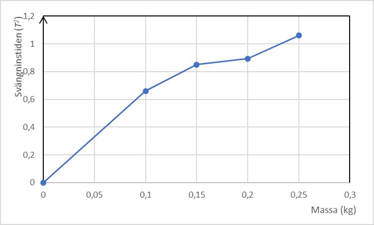 där m är viktens massa och k är fjäderkonstanten. Gör en omskrivning av denna formel så att den kan jämföras med det som visas i ditt andra diagram med svängningstiden i kvadrat som funktion av massan. Anpassas en linje till mätpunkterna i detta diagram så kan denna linjes lutning, säg , användas för att få ett värde på fjäderkonstanten k. Den anpassade linjen har en algebraisk beskrivning som kan jämföras med .