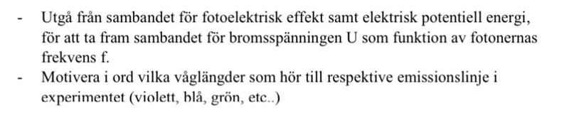 Hej under en laboration där en kvivkssilverlampa och bromsspänning används tillsammans med emmisionslinjer ska jag slutligen ta fram ett värdw på plancks konstant. Men först har jag dessa instruktioner. Från experimentet har jag olika Värden på spänningen samt våglängd för respektive emissionslinje.
