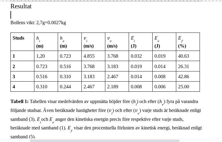 Tack för svar! isåfall måste mina mätvärden vara fel och resultera i dessa skumma resultat. Det är svårt att mäta höjden av studsen, jag försökte vara så nogrann som möjligt med att mäta höjden men det är fömodligen pågrund av fel under mätningen som resultatet blev såhär.