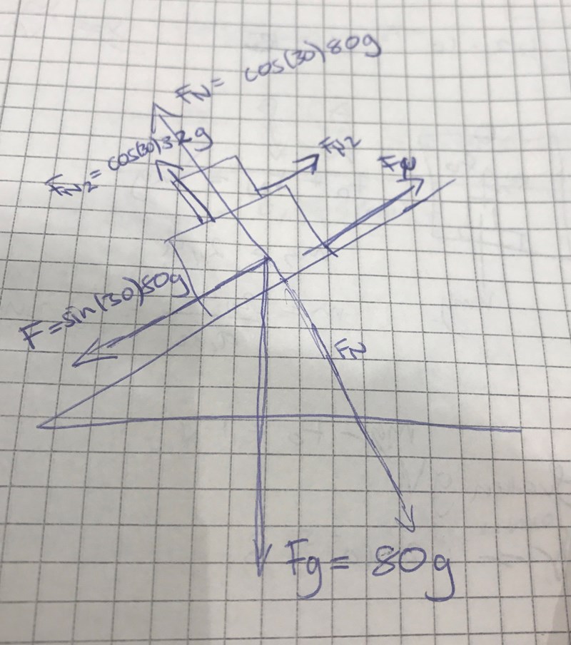 Sen tänker jag helt enkelt att man adderar ihop båda friktionskrafterna för att få den totala friktionen, men jag är osäker då jag inte stött på liknande fråga förut. Jag förstår dock att man även ska tänka på att normalkraften för ena blir räknad med en massa på 32 medan den andra normalkraften räknas på en massa av 32+48= 80kg samt att normalkraften blir en av tyngdkraftens komposanter.