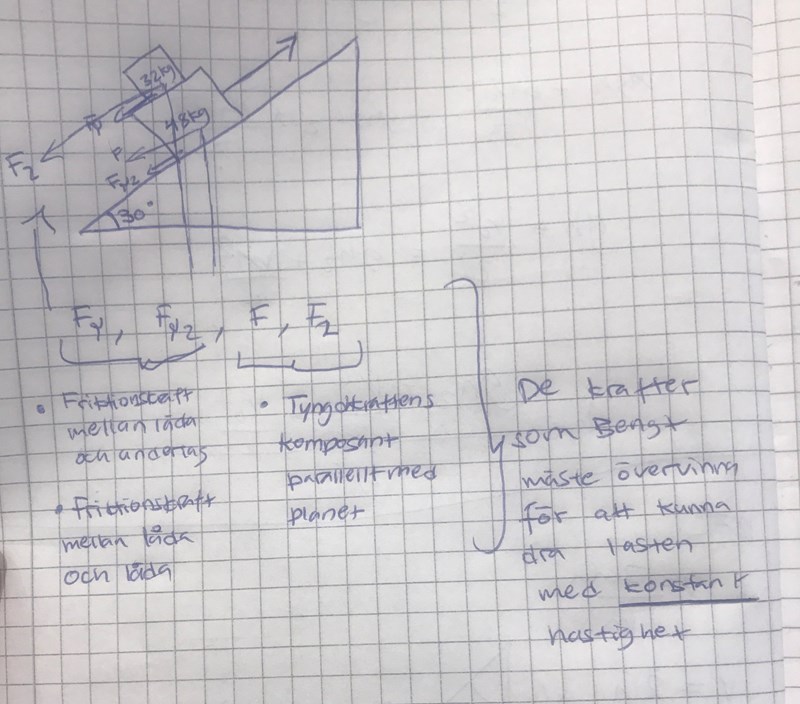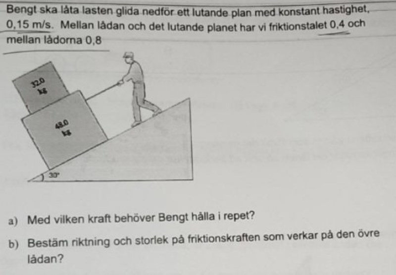 på övre lådan verkar mg med komposanten snett nedåt vänster att dra lådan framåt nedåt dvs med mgsin(30) och hålls emot med en friktionskraft F