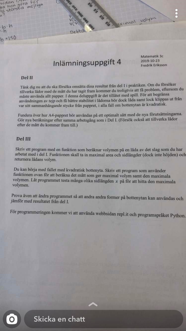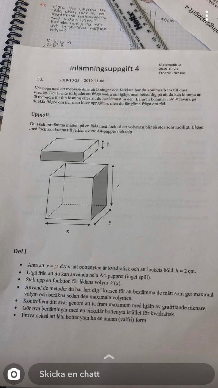 Börja med att skriva upp ett uttryck för lådans volym. Det är detta uttryck du sedan ska maximera.