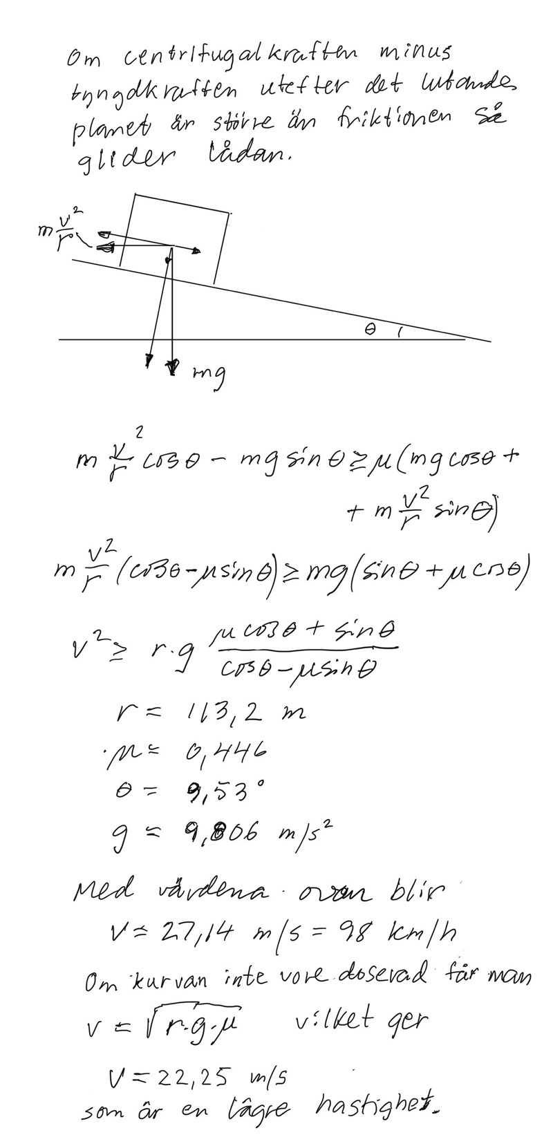 En låda med massa m ligger på ett lastbilsflak. Lastbilen kör i en doserad (= lutande) kurva med farten v, se figur. Lutningen på vägbanan är θ och bilens bana har krökningsradie ρ. Det finns friktion mellan flaket och lådan. Lådan ska förbli på flaket. Räkna med tyngdaccelerationen g = 9,806 m/s².Hur stor är den maximala farten ifall banradien är ρ = 113,2 m den statiska friktionskoefficienten är 0,446, massan är m = 5,900 kg och doseringen är θ = 9,53°?