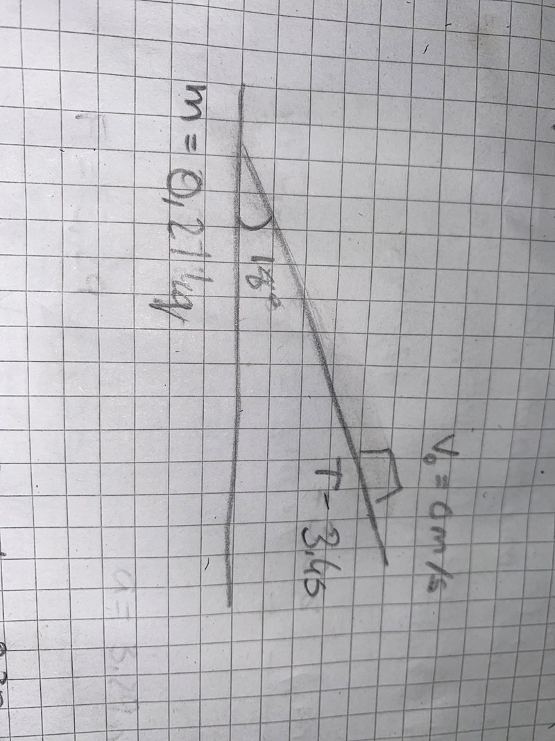 En låda med massan 210 g startar i vila och glider friktionsfritt längd med ett lutande plan. Planets vinkel med horisontalplanet är 18 grader.