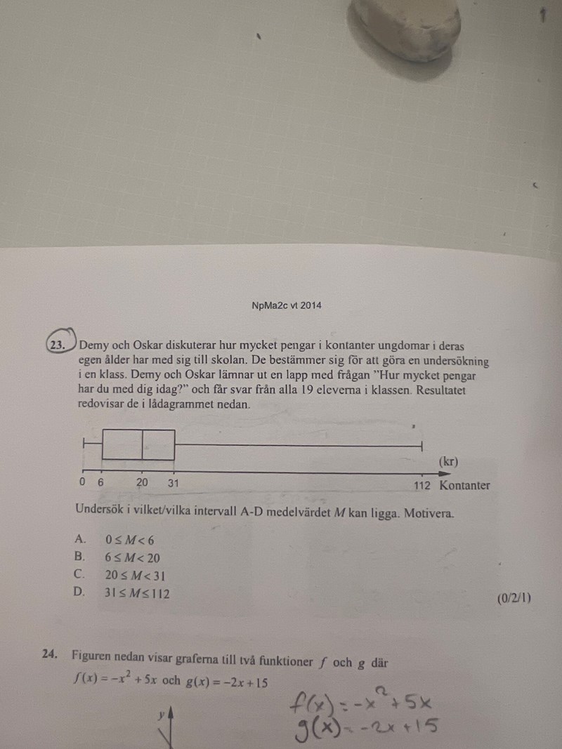 Det vi kan se av lådagrammet är (om vi räknar upp eleverna från den som har minst till den som har mest) att elev 1 har 0 kr, elev 5 har 6 kr, elev 10 har 20 kr, elev 15 har 31 kr och elev 19 har 112 kr. För att få det lägsta medelvärdet kan vi tänka oss att alla har sså lite som möjligt, d v s  elev 2-4 har 0 kr, elev 6-9 har 6 kr, elev 11-14 har 20 kr och elev 16-18 har 31 kr. Räkna ut medelvärdet i detta fall. För att få det högsta medelvärdet antar vi att elev 2-4 har 6 kr, elev 6-9 har 20 kr, elev 11-14 har 31 kr och elev 16-18 har 112 kr. Räkna ut medelvärdet i detta fall. Vilket eller vilka svarsalternativ stämmer?