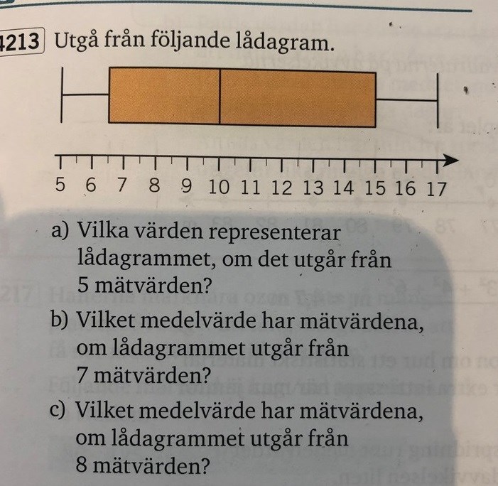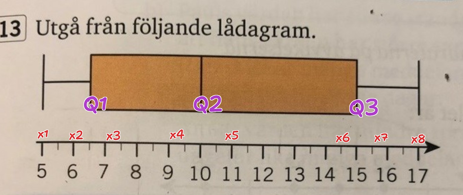 Vädldigt bra förklarat, om jag nu förstått det rätt började jag att ställa upp 5 x2 x3 9 11 x6 x7 17 . Som du påpekade Q1 är medelvärdet av x2 och x3 och Q1 är ju utifrån lådagrammet 6.5. Därför kan man sätta x2 = 6 och x3 = 7 Sedan samma visa för x6 och x7 då få fram 14 + 16/2 = 15 vilket är Q3. alltså blir talen 5 6 7 9 11 14 16 17 medelvärdet av dessa blir 10.625. Har jag försått det rätt eller är det något jag saknar för att bygga upp förklaringen. Finns det något knep för alla sådana uppgifter?