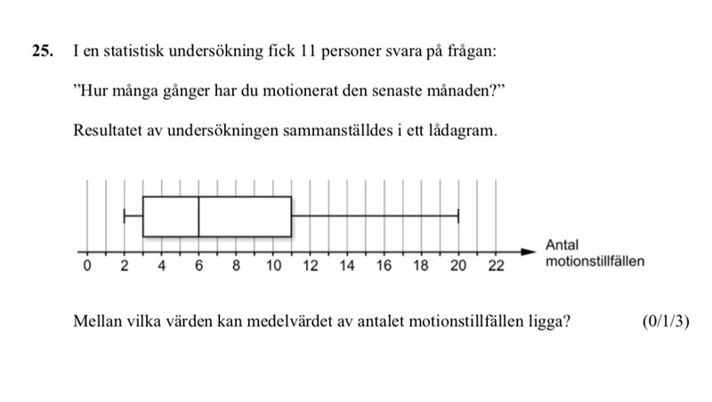 Numrera de 11 personerna 1-11 från den lataste till den hurtigaste. Du vet att nr 1 tränade 2 ggr. Du vet att nr 11 tränade 20 ggr. Vilket nummer har medianen, spm tränade 6 ggr? Vilket nummer har 25%, som tränade 3 ggr? Vilket nummer har 75 %, som tränade 11 ggr?