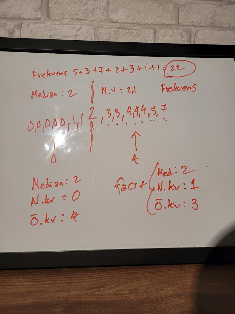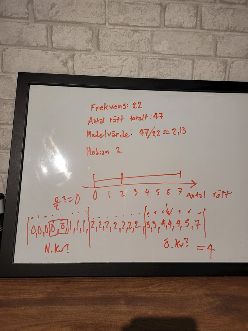 Nu syns bilden! Jag har hunnit räkna att det är 22 olika värden, men inte kollat mer än så. Har du hittat medianen, medelvärdet, övre och undre kvartil? (Ja, jag ser att du har hittat medianen och medelvärdet).