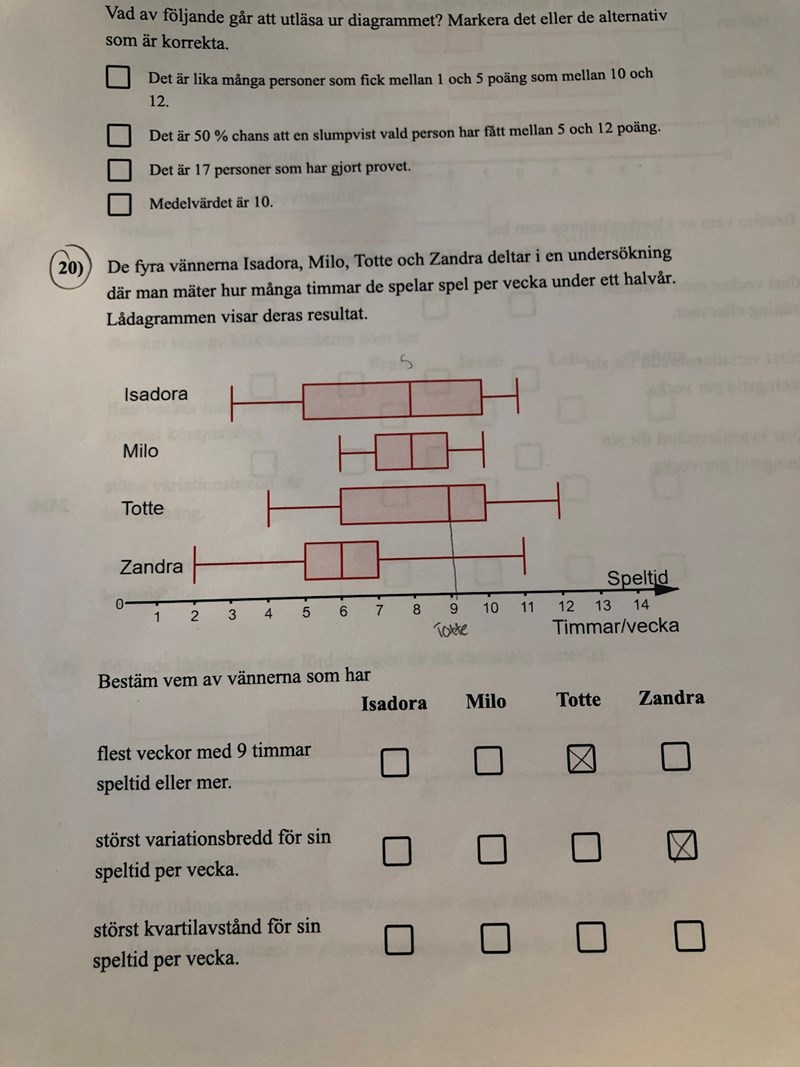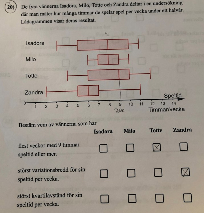 Titta på vilken av personerna som har längst "låda". Milo och Zandra har de kortaste lådorna, Isadora har den längsta. Lådorna sträcker ju sig från 25 % till 75 %, så det är precis just kvartilavståndet.