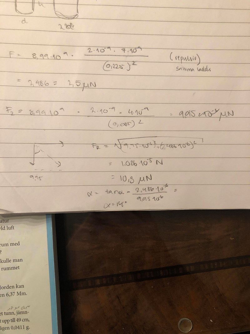 3 laddade kulor befinner sig vid punkterna A, B och C, enligt ABC är vinkeln rät. Kulornas laddning och inbördes avstånd framgår i figuren nedan. Bestäm den elektriska kraften, storlek och riktning på B. Riktning kan anges som vinkeln mellan resultanten och linjen BC.