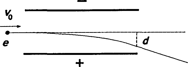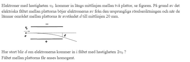 Jag skulle börja tänka såhär. Den rörelseekvation som bestämmer avståndet är där är accelerationen som partikeln får i y-led av det elektriska fältet, och är tiden som partikeln befinner sig mellan plattorna.