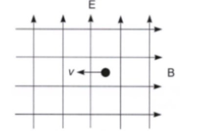 Figuren visar två korsande, homogena fält, ett elektriskt fält , med fältstyrkan2,3 kV/m och ett magnetiskt fält med flödestätheten 0,27 T. En elektron rör sig i ettvisst ögonblick med hastigheten 15 km/s i pilens riktning.